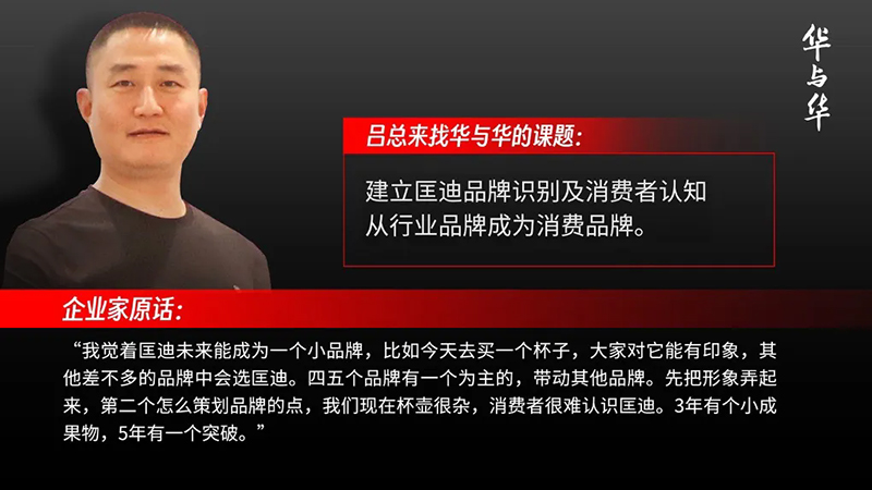 有了很雄厚的實(shí)力和很恰當(dāng)?shù)臅r(shí)機(jī),呂總就希望建一個(gè)品牌,讓人能夠知道他的匡迪,希望大家今天去買一個(gè)杯子,讓大家對(duì)匡迪能有印象。所以2023年來找華與華,開啟了匡迪的品牌建設(shè)之路。