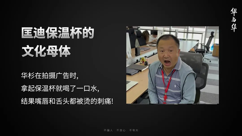 今天,“匡迪”這個(gè)名字、匡迪的杯子、匡迪燙嘴哥和“匡迪保溫杯,明天還燙嘴”無法再被分開,因?yàn)槿A與華出手,它們就成為了一個(gè)整體,這個(gè)包括了產(chǎn)品、話語和符號(hào)的品牌就成型了。