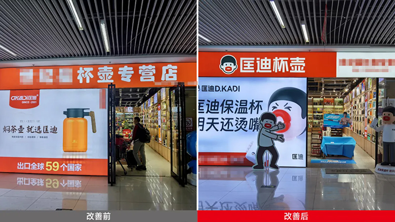 走進(jìn)門店,你會(huì)發(fā)現(xiàn)我們把原來的貨架改造成了“發(fā)光海報(bào)”,匡迪的標(biāo)志、燙嘴哥形象和企業(yè)背書全都亮在那里,讓人不由自主想進(jìn)店一探究竟。