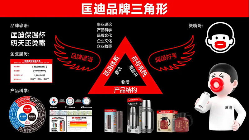 當(dāng)我們極具戲劇性的“匡迪保溫杯,明天還燙嘴”的口號(hào),以及“燙嘴哥”的超級(jí)符號(hào)出來后,大眾跟它的隔閡就瞬間消失了,這就是超級(jí)符號(hào)的創(chuàng)意力量。